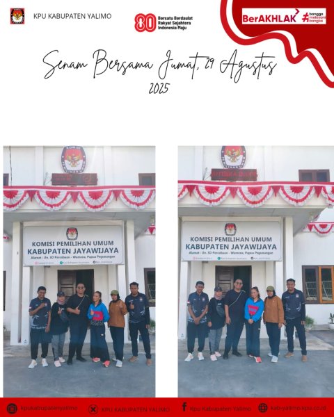 KPU Kabupaten Yalimo mengikuti kegiatan Senam bersama Jumat, 29 Agustus 2025. Dalam rangka meningkatkan kesehatan, kebugaran jasmani, dan untuk menjalin keakraban serta tali silaturahmi di lingkungan KPU Provinsi dan KPU Kabupaten se-Papua Pegunungan.