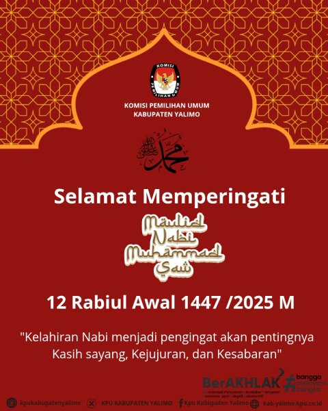 Kami jajaran KPU Kabupaten Yalimo mengucapkan Selamat Memperingati Maulid Nabi Muhammad SAW 12 Rabiul Awal 1447/ 2025 M.