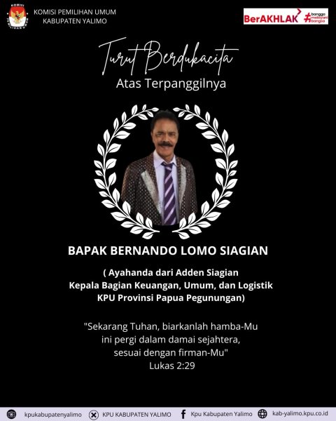 Perjalanan hidup di dunia, tak akan ada yang tahu kapan akan terhenti kecuali yang telah mempunyai kuasa atas hidup kita umatnya, dengan penuh duka cita dan ketulusan hati, Keluarga besar KPU Kabupaten Yalimo menyampaikan ungkapan Turut Berdukacita atas meninggalnya Bapak Bernando Lomo Siagian, Ayahanda dari Bapak Adden Siagian Kepala Bagian Keuangan, Umum, dan Logistik KPU Provinsi Papua Pegunungan.