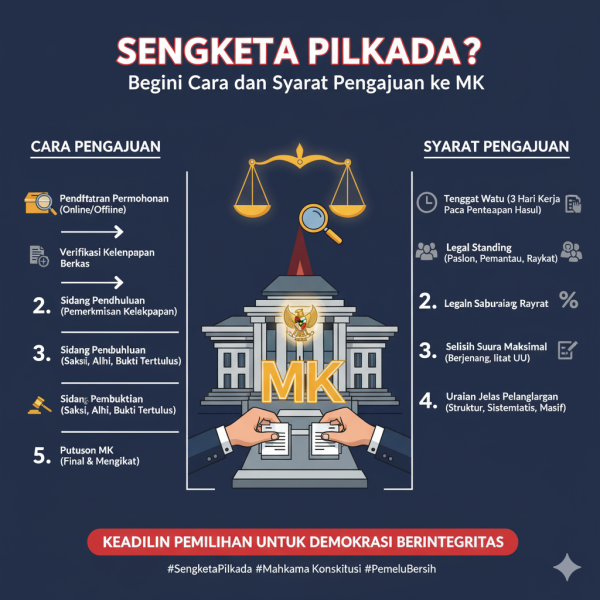 Sengketa hasil Pilkada merupakan mekanisme hukum untuk menjaga keadilan dalam pemilu. Namun, tidak semua ketidakpuasan bisa langsung dibawa ke MK. Hanya perkara yang memenuhi syarat waktu, selisih suara, legal standing, dan bukti pelanggaran yang dapat diproses. Dengan memahami prosedur ini, Pilkada dapat menempuh jalur konstitusional secara tepat dan bertanggung jawab.