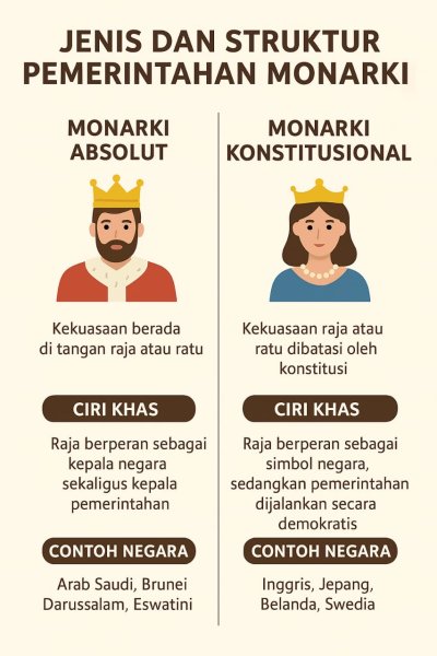 Dalam sistem pemerintahan di dunia, monarki merupakan salah satu bentuk pemerintahan tertua yang masih bertahan hingga kini. Meskipun banyak negara telah beralih ke sistem demokrasi, sejumlah negara tetap mempertahankan sistem monarki sebagai bagian dari tradisi, sejarah, dan identitas nasional mereka.