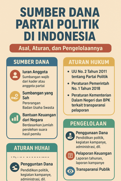 Sumber dana partai politik di Indonesia berasal dari iuran anggota, sumbangan sah, dan bantuan negara. Semua hal tersebut diatur oleh undang-undang agar terhindar dari penyalahgunaan dan praktik korupsi. Transparansi dan pengelolaan yang baik menjadi kunci agar partai politik tetap independen dan dipercaya oleh masyarakat.