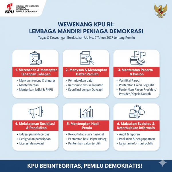 Melalui pelaksanaan seluruh wewenang tersebut, KPU menjadi garda terdepan dalam menegakkan kedaulatan rakyat. Wewenang yang dimiliki bukan sekadar tugas administratif, tetapi juga tanggung jawab moral untuk menjaga integritas dan kepercayaan publik terhadap proses demokrasi di Indonesia.