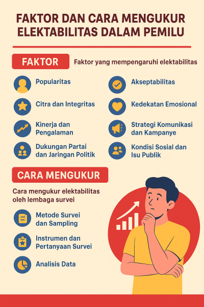 Elektabilitas bukan sekadar angka yang muncul di hasil survei, melainkan cerminan kepercayaan publik terhadap figur atau partai politik. Faktor seperti popularitas, citra, integritas, kedekatan emosional, kinerja, dan strategi komunikasi berperan penting dalam membentuk tingkat keterpilihan.