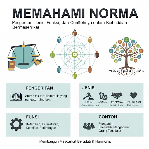 Dalam kehidupan bermasyarakat, setiap individu tidak dapat bertindak semaunya sendiri. Diperlukan aturan dan pedoman yang menjadi acuan agar hubungan sosial berjalan tertib, harmonis, dan saling menghormati. Aturan inilah yang dikenal sebagai norma, yaitu ketentuan yang mengarahkan perilaku manusia sesuai nilai dan harapan masyarakat. Kehadiran norma menjadi fondasi penting dalam membentuk keteraturan sosial, menjaga keseimbangan, serta mencegah terjadinya konflik di tengah kehidupan yang terus berkembang.